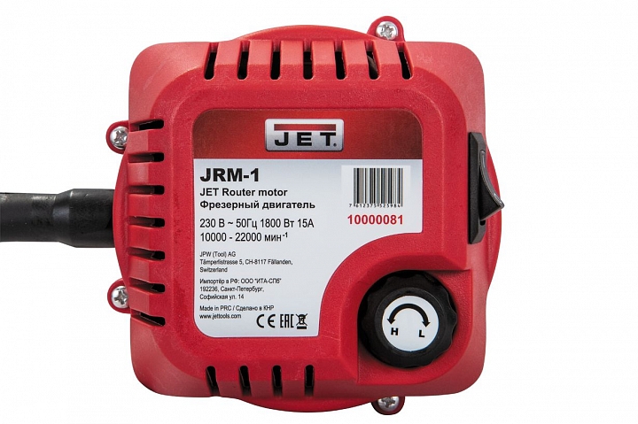 Фрезерный двигатель JRM-1 для установки в различные устройства и приспособления. В состав модуля входит коллекторный мотор, оборудованный выключателем и управляющей электроникой, позволяющей в широком диапазоне менять скорость вращения оснастки. На выходной вал монтируются цанговые зажимы диаметром от 6 мм до ½ дюйма. Корпус мотора сделан из металла в виде цилиндра, поверхность которого используется для крепления. Зажим должен быть выполнен в виде круглого разрезного хомута с эксцентриком или винтом для стягивания.