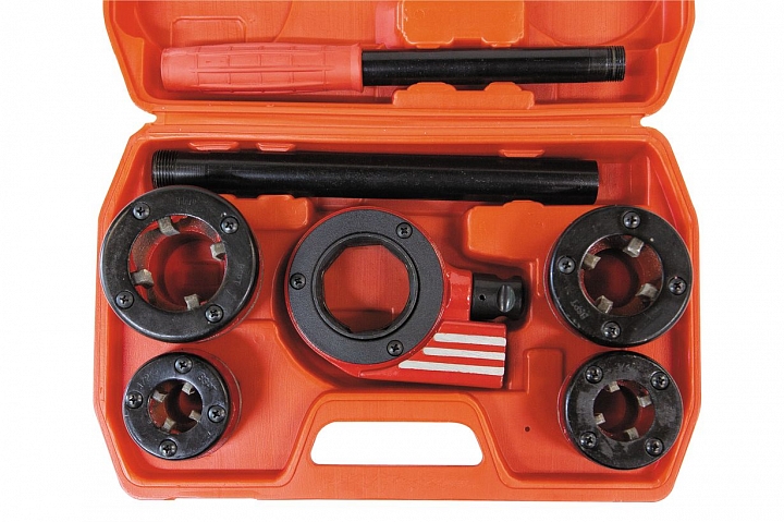 Набор клуппов для конической трубной резьбы с четырьмя быстросъемными головками: 1/2”, 3/4”, 1”, 1 1/4”.