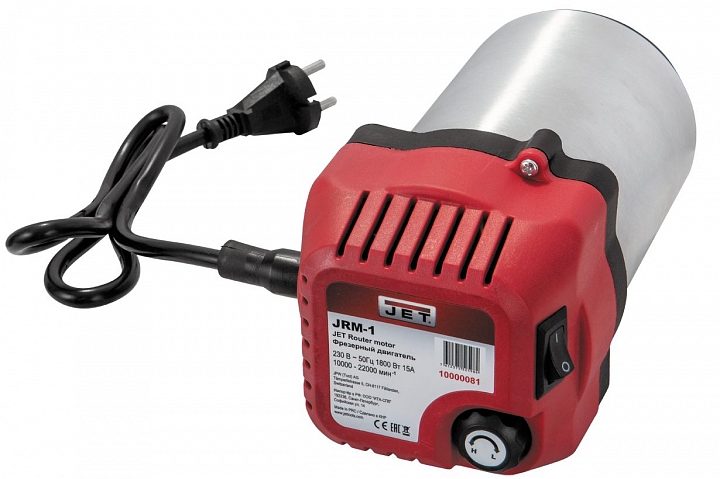 Фрезерный двигатель JRM-1 для установки в различные устройства и приспособления. В состав модуля входит коллекторный мотор, оборудованный выключателем и управляющей электроникой, позволяющей в широком диапазоне менять скорость вращения оснастки. На выходной вал монтируются цанговые зажимы диаметром от 6 мм до ½ дюйма. Корпус мотора сделан из металла в виде цилиндра, поверхность которого используется для крепления. Зажим должен быть выполнен в виде круглого разрезного хомута с эксцентриком или винтом для стягивания.