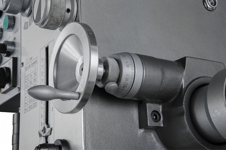 Модель оборудована мощным асинхронным электродвигателем - 1,1/1,5 кВт, обеспечивающий частоту вращения шпинделя в 2-х диапазонах 75-1600 об/мин и 150-3200 об/мин. Станок оборудован коробкой скоростей для выбора необходимой частоты вращения, по 6 скоростей в каждом из двух диапазонов. Функция включения реверса шпинделя позволяет осуществлять нарезание резьбы.